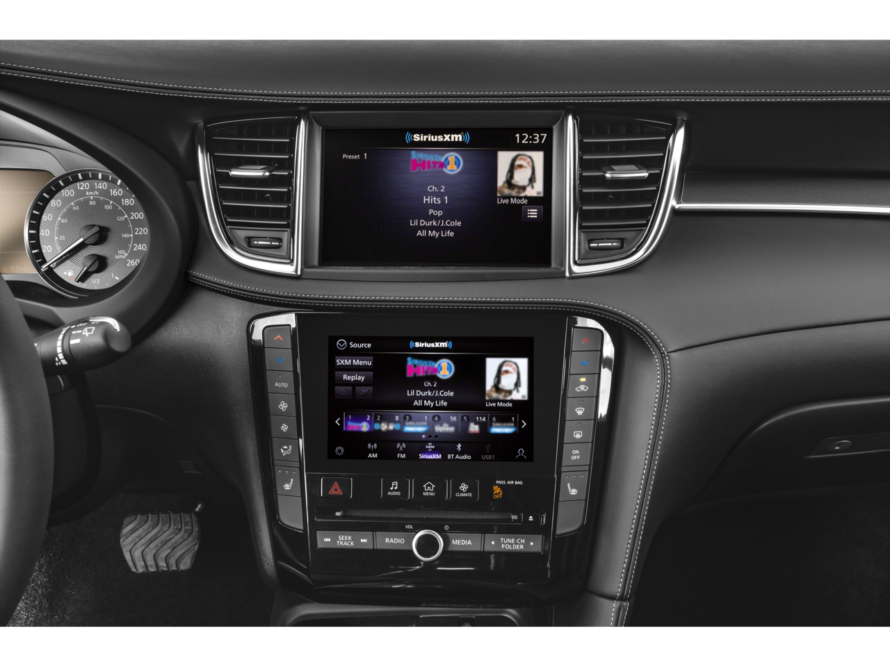 - Radio: HD Audio System -inc: 6 speakers, INFINITI InTouch, INFINITI InTouch services, INFINITI InTouch dual display system w/upper 8" and lower 7" HD touch screens, wireless Apple CarPlay, Android Auto, HD Radio technology, SiriusXM radio w/advanced audio features and 90-day complimentary trial, SiriusXM Travel Link w/90-day complimentary trial, INFINITI voice recognition, Siri Eyes Free, Wi-Fi hotspot, active noise cancellation, Bluetooth® hands-free phone system and streaming audio via Bluetooth®